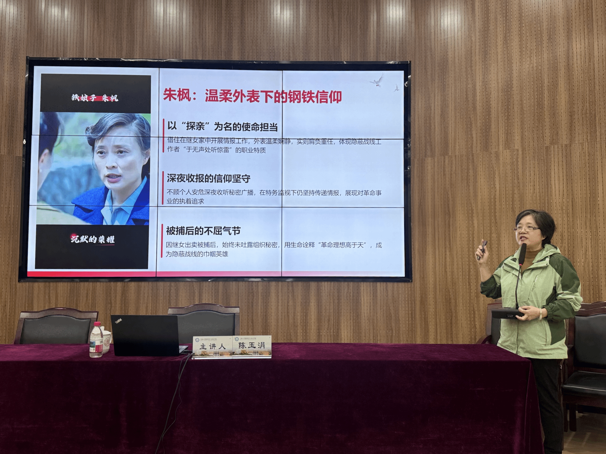 课程重点结合《沉默的荣耀》中感人至深的英雄事迹,深刻揭示了平凡与伟大的辩证关系,以及信仰力量的巨大能量。陈老师生动讲述了吴石将军所展现的果断沉稳的战略定力、舍家为国的大义担当和至死不渝的忠诚底色。陈玉涓老师口中的吴石将军临危授命的信仰践行者朱枫同志温柔外表下有着钢铁信仰聂曦与陈宝仓则展现了信仰共同体的生死相依。通过对这些“隐蔽英雄”的分析,陈老师总结出深刻启示:伟大源于平凡岗位的坚守,信仰的力量在“沉默”中爆发,于无声处听惊雷。