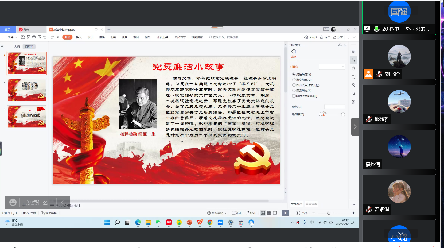 本科生第一党支部共有20个小组参加,每位分享人通过视频、PPT或给视频配音等形式分享廉洁故事,每个组都展现了各自的特色,以不同的侧重点为支部成员讲好廉洁故事,永葆初心本色。本科生第二支部通过分享身边的廉洁故事,宣传校园清廉典型人物和事迹,用讲身边故事的形式使支部同学在看得见摸得着的文化环境中接受熏陶,号召学生党员养成“清廉”的行为习惯,树立“廉洁为民”的思想决心。分享过程中,参会党员认真聆听,也纷纷谈了感悟,表示要增强政治意识,要以更高的标准、更严的要求规范自身行为,汲取榜样力量,坚守政治底色,勇担时代重任和历史使命。