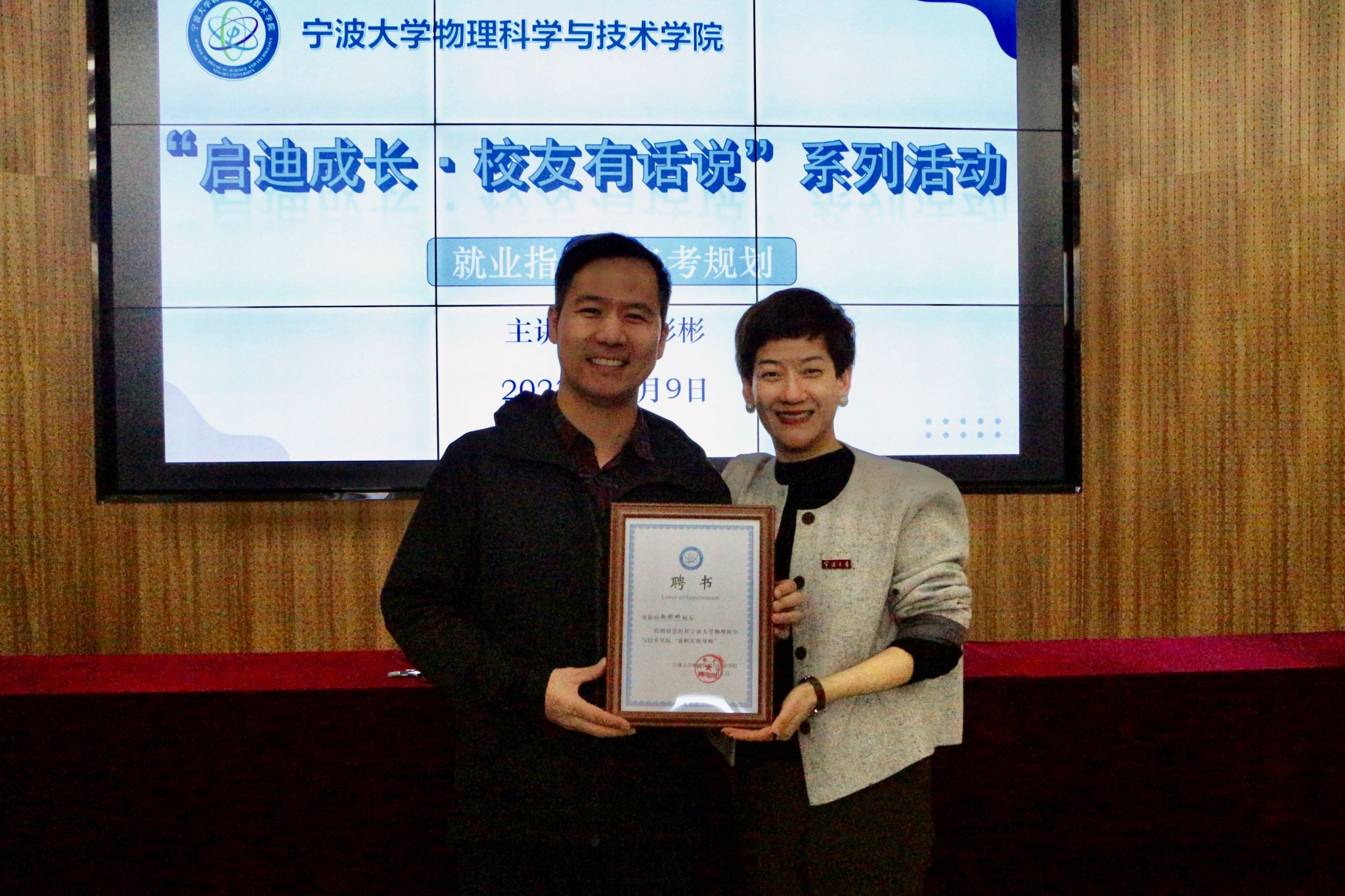 活动最后,院党委副书记刘小娣为赵彬彬校友颁发“兼职生涯导师”聘书,感谢他对母院学生职业生涯规划和成长成才的倾心指导。