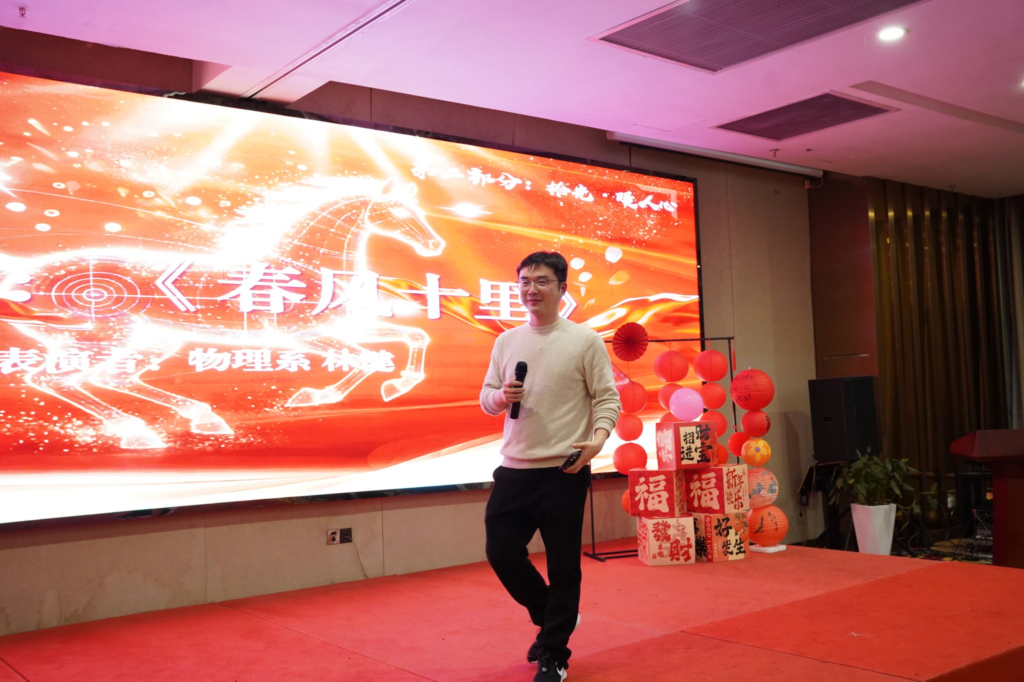 在“学院有喜”环节,学院领导为新婚新育的教职工送上精心准备的礼物,传递美好的新春祝福。物理系林键老师作为新婚教师代表献上深情演唱,歌声悠扬,赢得满堂喝彩。