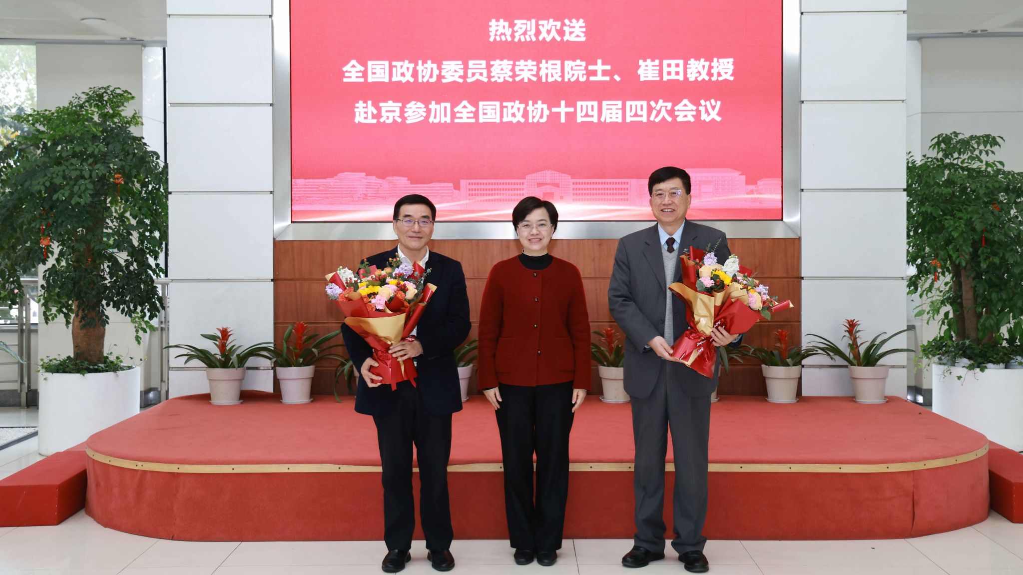 2月28日,学校在安中大楼一楼大厅,为即将赴京参加全国政协十四届四次会议的全国政协委员、校长蔡荣根院士,全国政协委员、高压物理科学研究院院长崔田教授举行欢送仪式校党委书记张瑞丽出席