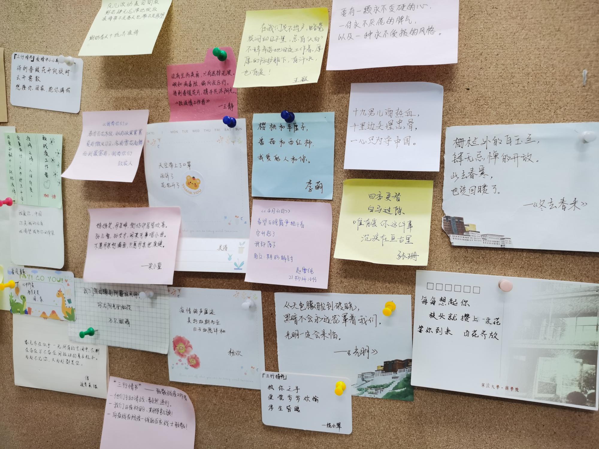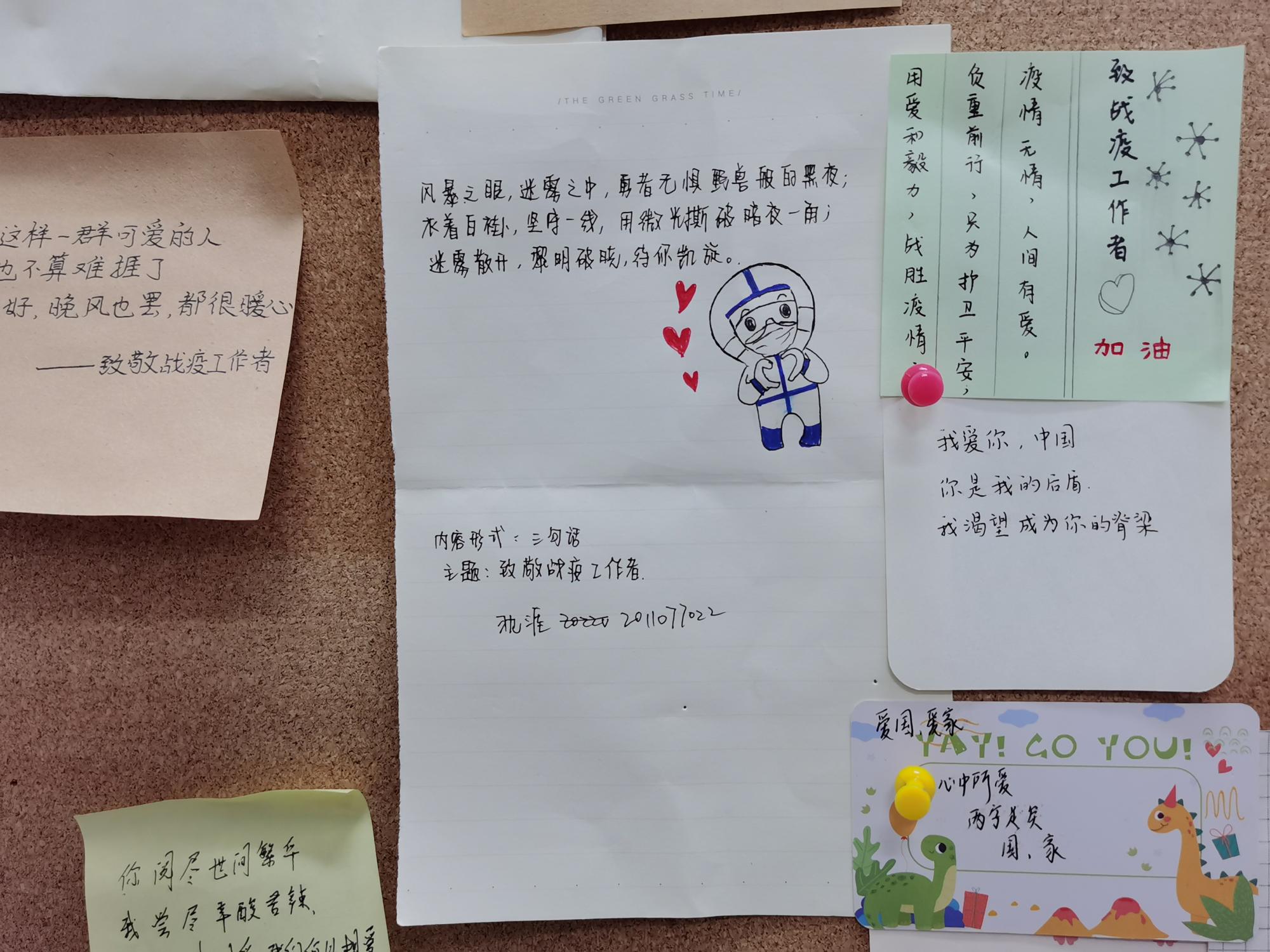 活动发起后,同学们积极参与投稿,累计收到投稿近百份。经初步审核,共筛选相关作品三十余份,所选作品均字迹工整、感情充沛、文笔优美。物院学子对党、对国家、对疫情志愿者及家人朋友最真挚的情感跃然纸上,在思想上和行动上高度践行了学院举办本次活动的初衷。投稿截止后,优秀作品在色花堂 微信公众平台展出。