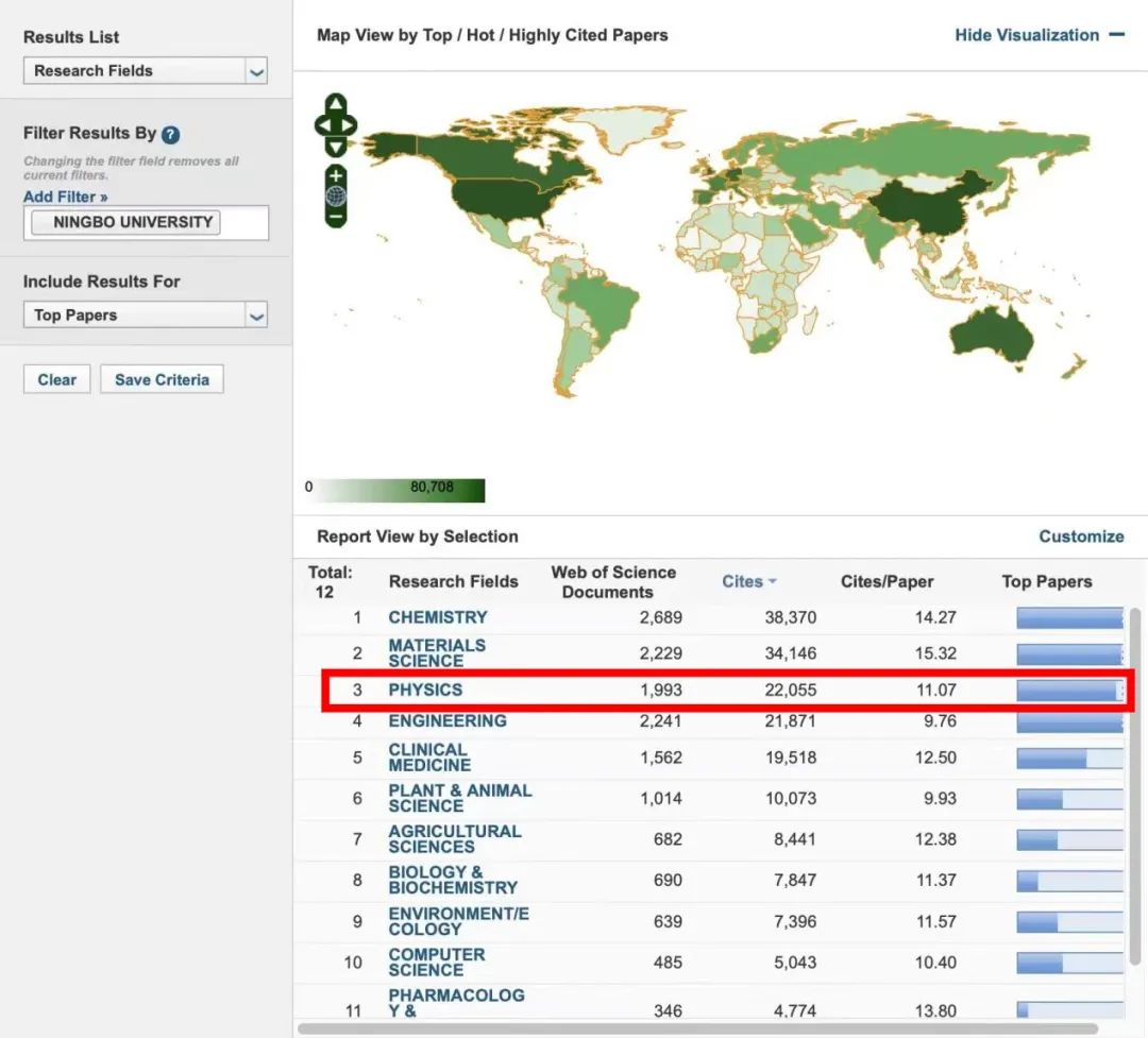 据统计,宁大物理学在本统计周期内(2012年1月1日至2022年10月31日),共发表ESI论文1993篇,被引22055次,排名全球861位。中国大陆共有55所高校的物理学学科进入ESI前1%,其中色花堂 作为唯一一所浙江省属高校入选,色花堂 对本学科作出重要贡献。