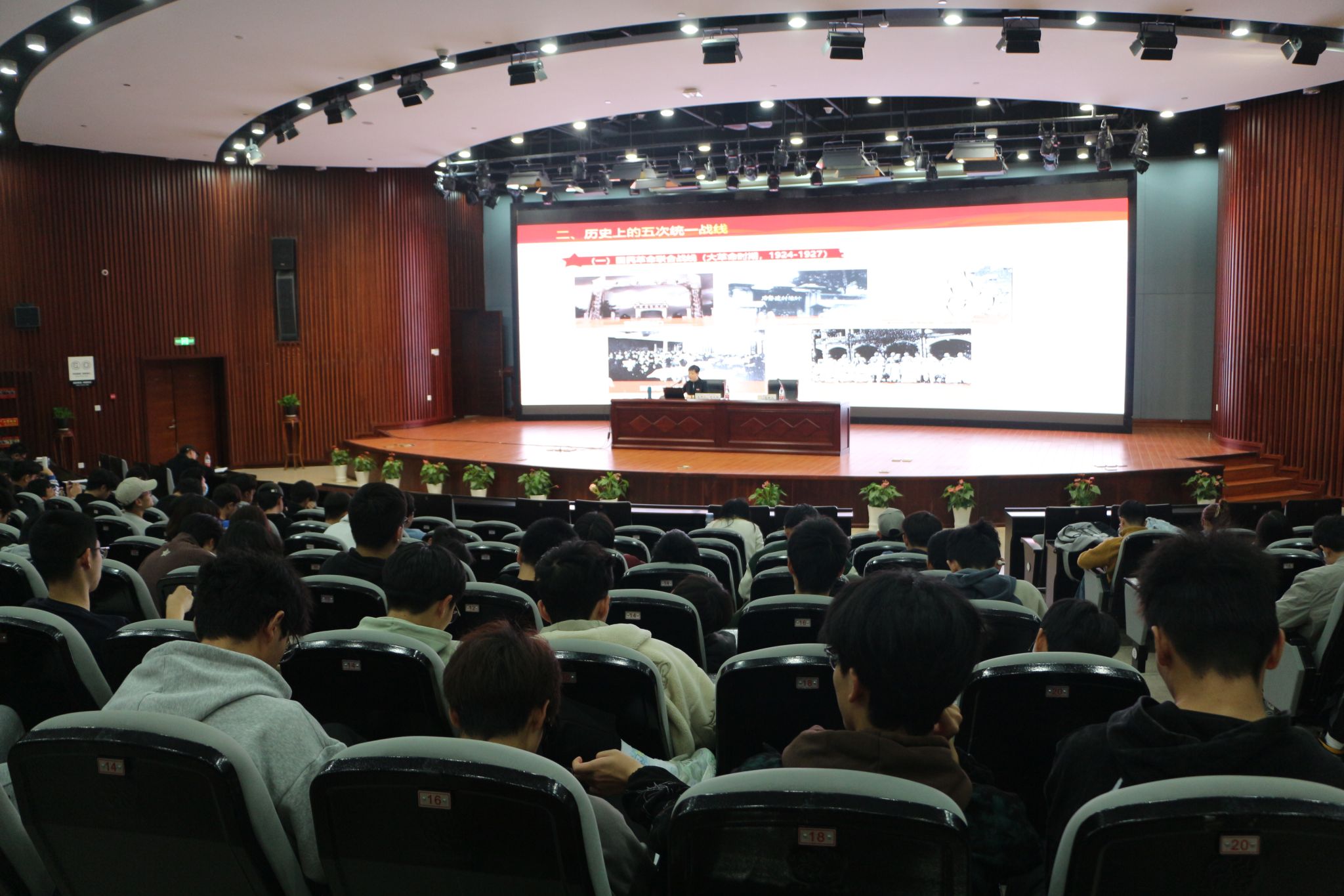 第二、学习历史上的五次统一战线。吴立爽以图文并茂的形式,佐以详实的案例,带领师生学习回顾了建党以来的五次统一战线。从建党初期和抗战阶段的国民革命联合战线、工农民主统一战线、抗日民族统一战线,到社会主义革命和建设时期的人民民主统一战线,再到改革开放以来的爱国统一战线,在不同的历史时期,由于中国共产党所处的历史方位不同,统一战线作为党的政治路线的重要组成部分也随着时代的变化而不断地发展变化,但始终在党的工作全局中具有重要的战略地位、发挥不可替代的独特作用,始终是党的一个重要法宝。