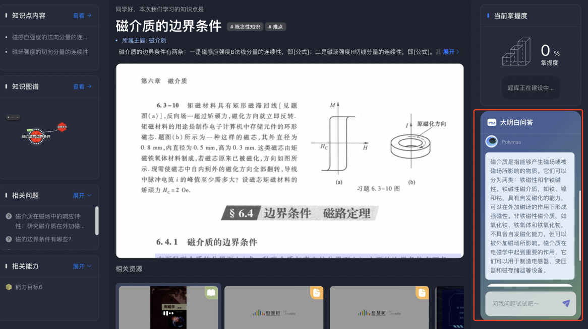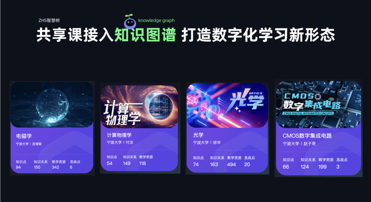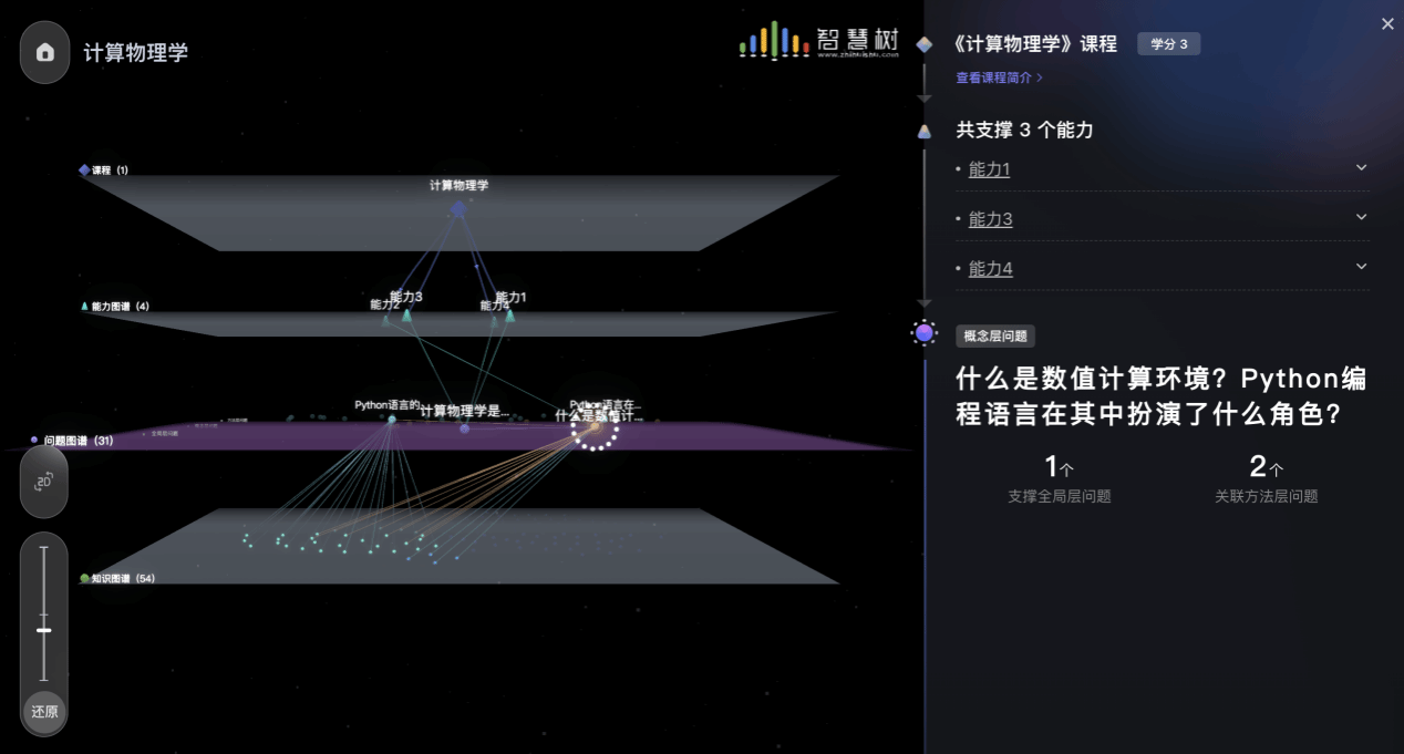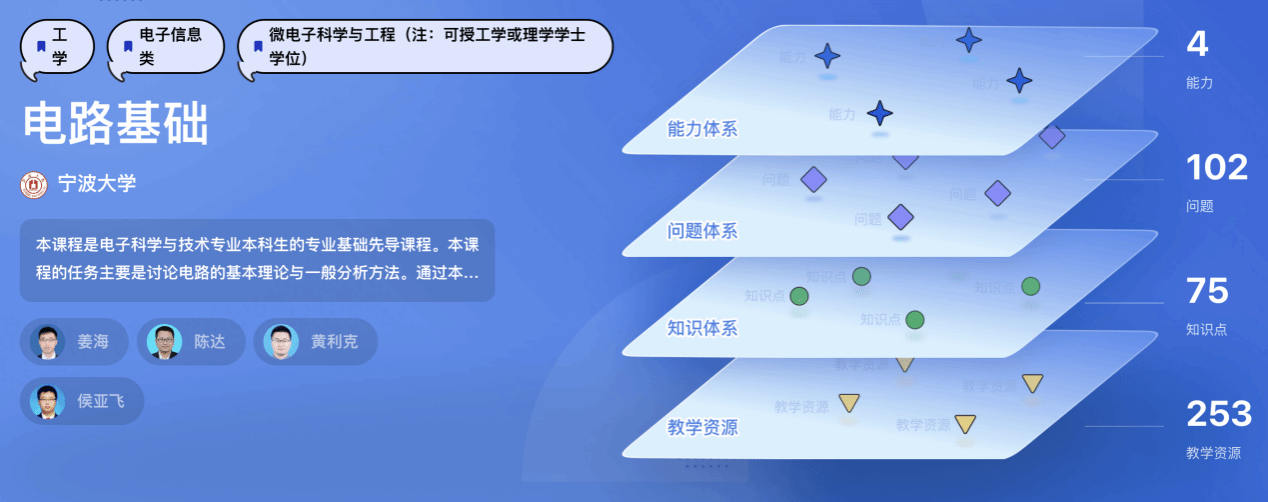 在知识图谱AI课程筹划和建设的过程中,各课程团队成员和智慧树团队一起研讨教学创新亮点,他们运用丰富的案例、互动讨论和在线实验等方式,让学习过程既富有挑战性又充满乐趣。团队聚焦课程目标、知识框架、学习逻辑等关键问题,拆解、细化专业知识。结合教学实施情况,“电磁学” 知识图谱AI课程系统搭建了7项能力目标,梳理了75个问题,94个知识点,构建了150个知识关系,拓展了342个教学资源;“计算物理学” 知识图谱AI课程系统搭建了4项能力目标,梳理了31个问题,54个知识点,构建了149个知识关系,拓展了118个教学资源;“光学” 知识图谱AI课程系统搭建了3项能力目标,梳理了114个问题,72个知识点,构建了156个知识关系,拓展了509个教学资源;“电路基础”知识图谱AI课程系统搭建了4项能力、梳理了102个问题,75个知识点,构建了131个知识关系,拓展了253个教学资源;“CMOS数字集成电路”知识图谱AI课程系统搭建了7项能力目标、梳理了31个问题,66个知识点,构建了127个知识关系,拓展了199个教学资源。每门知识图谱AI课程均包含教学资源层、知识体系层、问题体系层、能力体系层等4个维度,将每门课程的知识点有机地联系在一起,形成了一个完整的、多维度的知识网络,帮助学生全面掌握课程知识体系,加强对色花堂