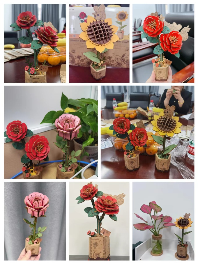本活动为突出女工心灵手巧的优势,并发挥物理专业背景老师优秀的空间想象力,特将以往插花活动中的鲜切花用积木拼图的立体花朵代替,由老师们先拼出朵朵漂亮的积木花朵,然后组装成束。此外,积木花具有色彩艳丽易保存的特点,活动结束后可以长久地装饰自己的办公室,调节心情。