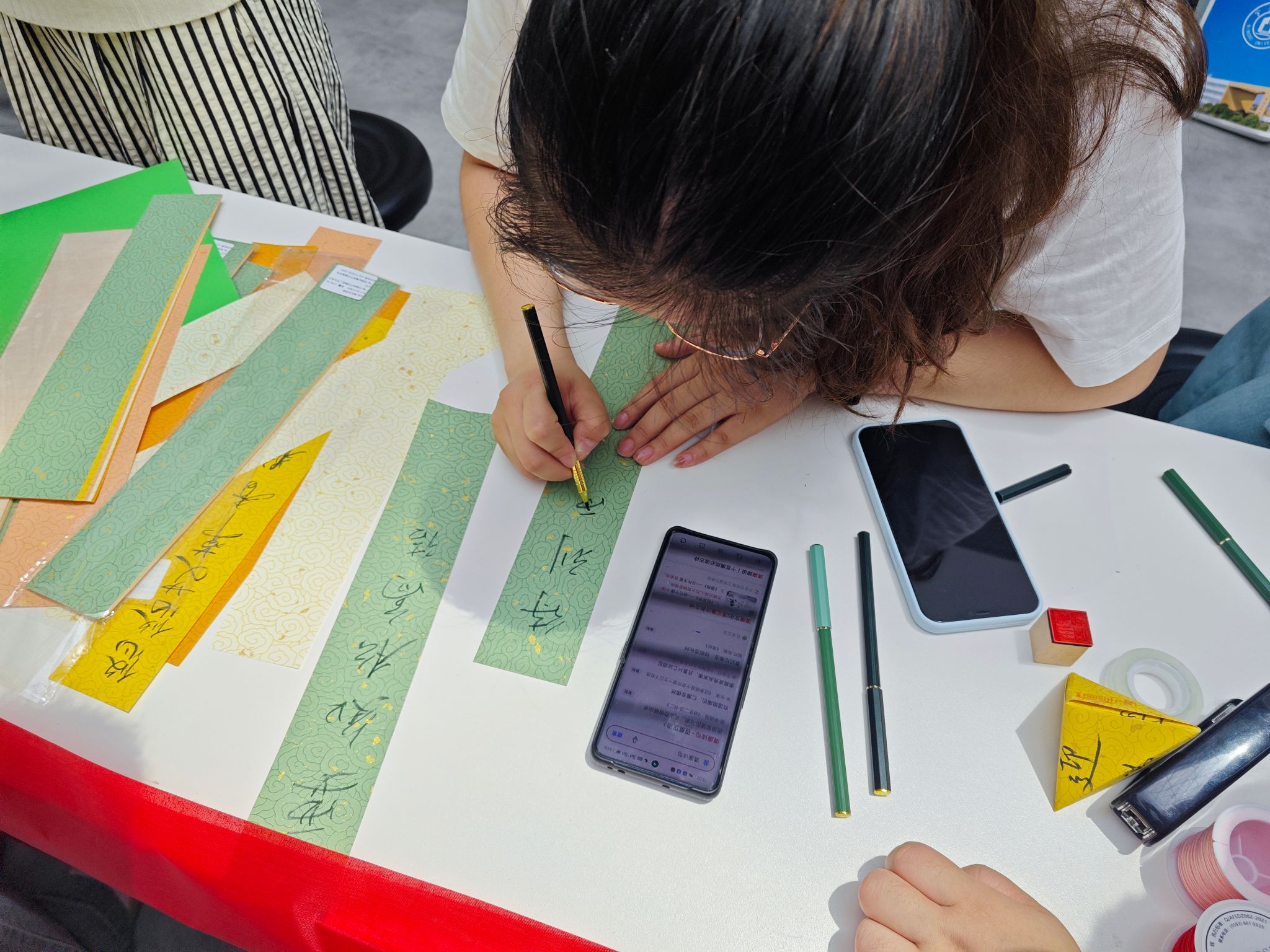 活动现场还设计了“制作一颗廉洁粽”手工环节。首先是“系牢廉洁绳”,通过端午五彩绳的编织,鼓励同学们以廉洁自律为绳,将行动和思想紧密联系在一起。此外,同学们还精心挑选书法纸,写上廉洁寄语并将其折叠包成一个个“书法粽”。