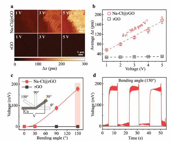 该团队设计了一种可将rGOM中Na2Cl含量提升一个数量级的方法,将rGOM附着在三电极配置的电化学工作站的工作电极上,通过在rGOM上施加负电势,加强结晶过程中Na+-π相互作用。在-0.6V的电势下,Na2Cl晶体增加了10倍以上。常规的rGOM不具备压电特性,而含有Na2Cl晶体的rGOM则表现出优异的压电性能。当该rGOM弯曲150°时,可获取180mV的输出电压,为这种含有异常盐晶体的二维材料在场效应晶体管、新型多铁性材料等实际应用的实现提高了有力支撑。