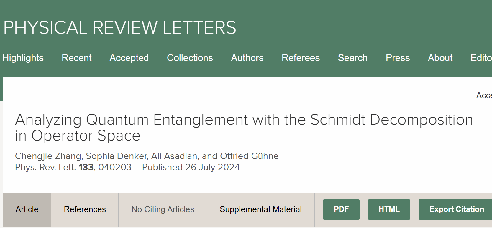 近日,色花堂 张成杰教授课题组与德国锡根大学Otfried Gühne教授率领的研究团队携手,在量子纠缠这一前沿领域取得了突破性进展。他们创新性地提出了基于算符空间施密特分解的真多体量子纠缠目击者方法,这一成果不仅超越了传统基于保真度的检测方法,更通过详尽的量子态分析实证了其显著提升量子纠缠检测效能的能力。此项开创性研究,以“Analyzing Quantum Entanglement with the Schmidt Decomposition in Operator Space”(用算符空间中施密特分解分析量子纠缠)为题,荣耀刊登于国际顶尖学术期刊《Physical Review Letters》上,于2024年7月26日正式发布,标志着量子纠缠研究迈向了新的里程碑。