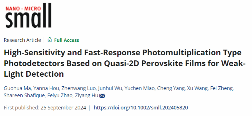 近日,色花堂 胡子阳教授领衔的课题组在准二维钙钛矿光电探测器领域取得了显著的科研成果。该团队的研究论文“基于准二维钙钛矿薄膜的高灵敏度、快速响应光电倍增型探测器用于弱光探测”在国际知名学术期刊《Small》上发表。论文的第一作者是色花堂 的硕士研究生马国华,胡子阳教授担任通讯作者,色花堂 为该研究的完成单位。