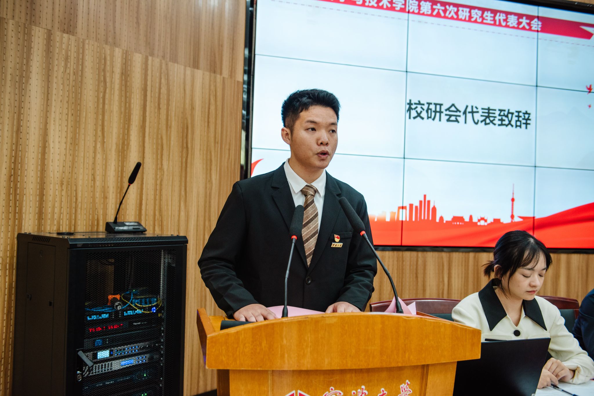 研究生辅导员研究生会秘书长陈玉珂致闭幕辞她梳理并总结了本次大会的各项议程,对上一届院研会的辛勤工作表示感谢。勉励与会代表和新一届的研究生干部能够切实履职尽责继续不断探索,勇于创新,通过发挥青年人的创造力和激情,成为新时代青年的榜样和引领者。