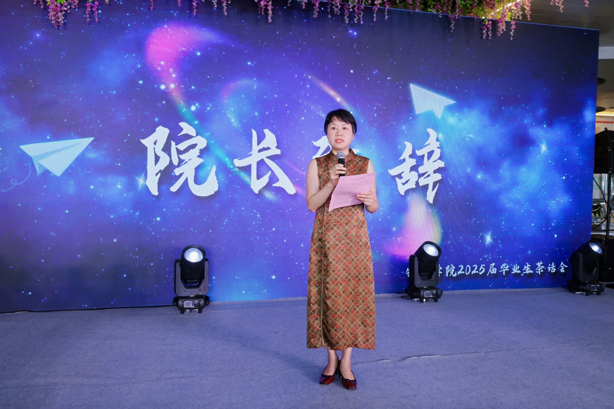 茶话会伊始,执行院长段香梅向全体毕业生致以诚挚的祝贺。她表示,2025届毕业生在学术科研、创新创业、服务家国等方面表现优异,以严谨的治学态度和创新的科学精神真正诠释了“求实致远”的院训真谛。她祝愿同学们在未来的人生道路上,前程如“电磁波”般广阔无界,事业如“超导体”般畅通无阻,人生如“守恒定律”般能量满满。