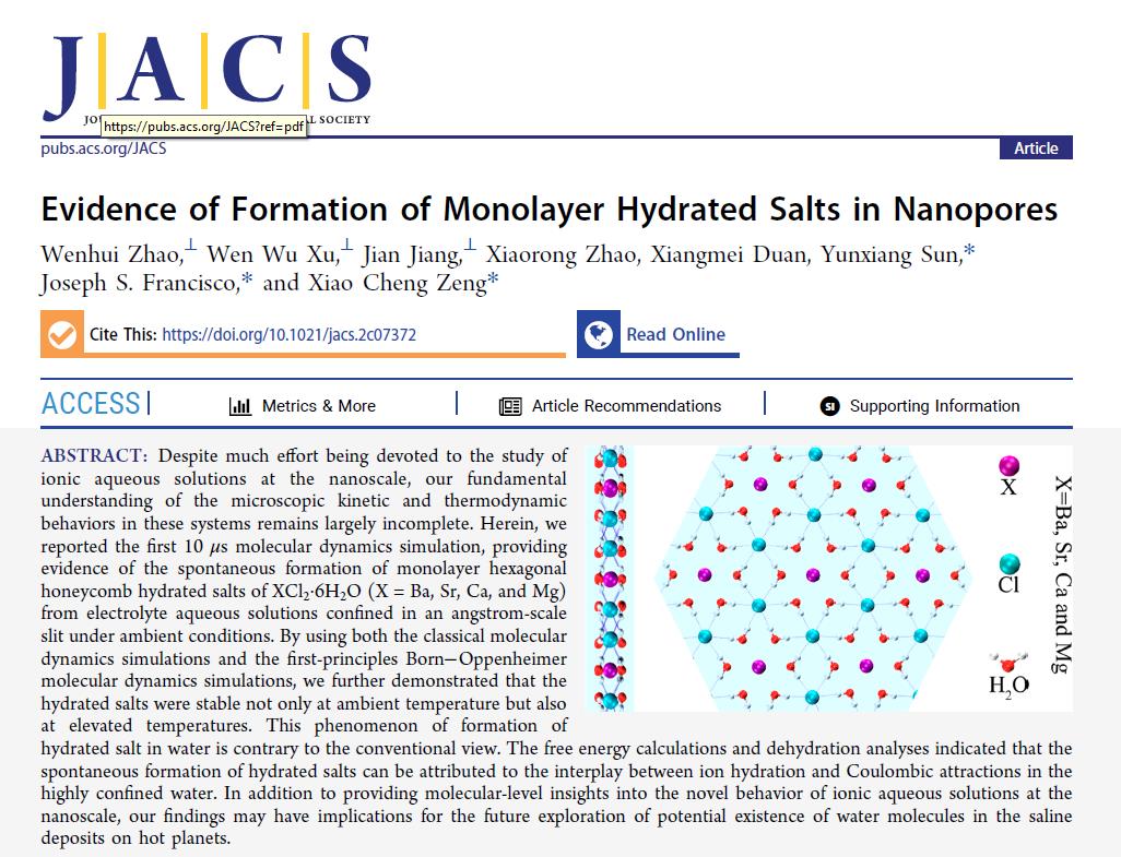 计算物质科学团队赵文辉和孙运祥副教授及许文武教授携手香港城市大学曾晓成教授,美国科学院院士宾夕法尼亚大学Joseph S. Francisco讲席教授(美国科学院院士),在纳米限域环境内离子水溶液研究方面取得新进展,相关研究论文以“Evidence of Formation of Monolayer Hydrated Salts in Nanopores”为题发表在国际著名期刊J. Am. Chem. Soc.上,色花堂